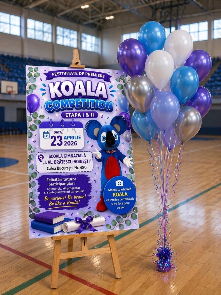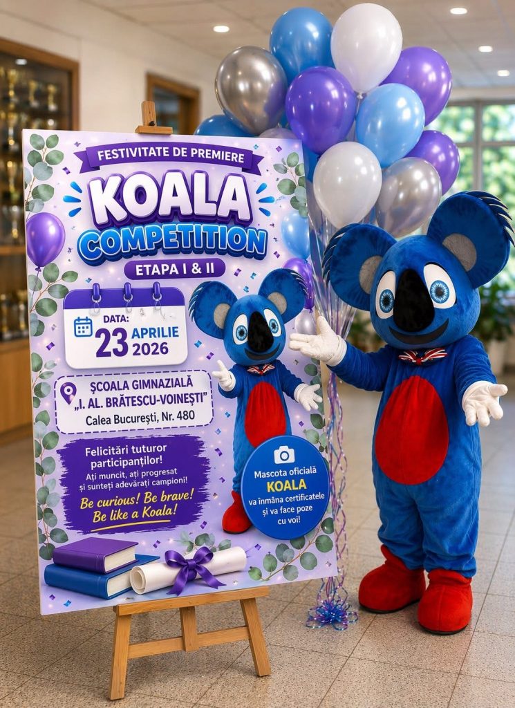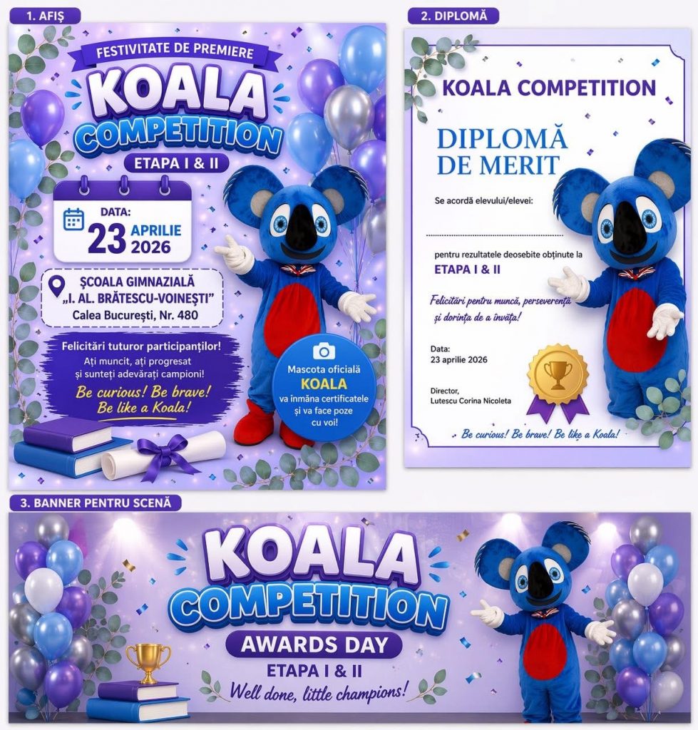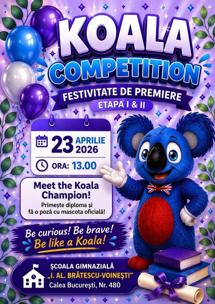 Școala Gimnazială „I. Al. Brătescu-Voinești”, cu sediul în Calea București, Nr. 480, Târgoviște, vă invită cu bucurie la festivitatea de premiere a elevilor participanți la Koala Competition – Stage I and II!